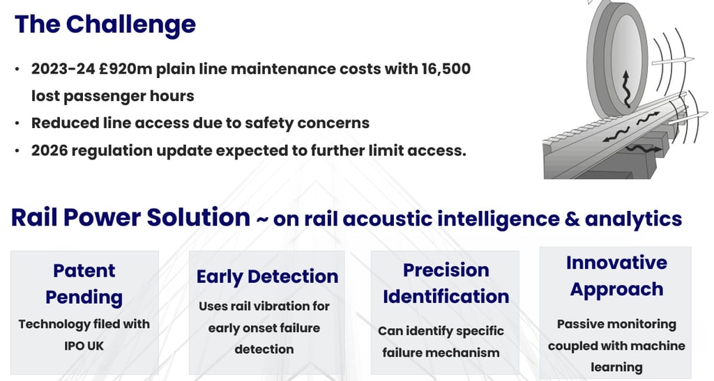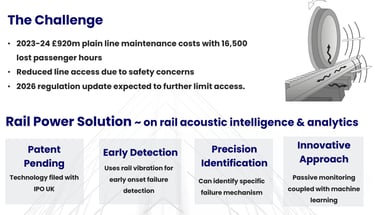 We have combined breakthrough materials engineering with advances in machine learning to produce a low power sensor providing rail analytics. We use the vibration from the rail to forecast failure. Importantly we can recognise early onset failure and can uniquely identify the failure mechanism at play.